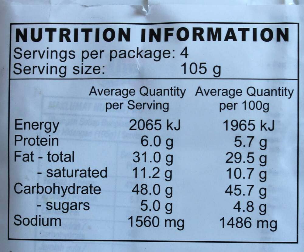 NOODLE (61%): Wheat Flour, Palm Olein [contains Antioxidant (320)], Salt, Stabilisers (412, 501, 500), Emulsifier (452).